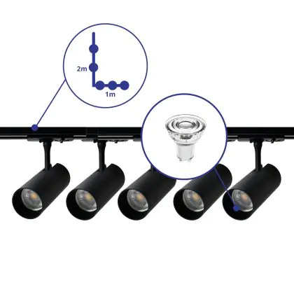 Descrizione Bright Choice Set completo 1-Fase Rail L 1 x 2 Metro Nero | incl. 5x Faretti + GU10 2700K 3W Dimmerabile + Tappo Di Chiusura, Connettore di Alimentazione e L -Connettore