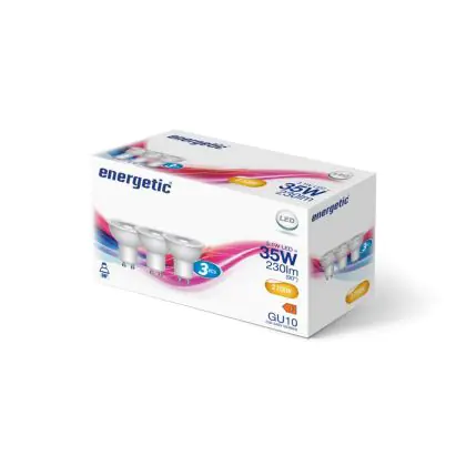 Puoi risparmiare fino al 90% tra il risparmio di energia e I costi di mantenimento grazie al basso consume di soli 3.1W e la lunga vita media utile di 15000 ore, comparandola invece con una lampada alogena GU10 con la sola durata di 2.000 ore. Inoltre le lampade LED non producono raggi IR e raggi UV dannosi per noi esseri umani tutto questo senza neanche produrre calore! Installarla è veramente semplice: ruotare la vecchia lampada GU10 di un quarto e rimuoverla dall’attacco. Successivamente inserire la lampada LED GU10 nell’attacco e girarla di un quarto per installarla. Questa è lampada di alta qualità Energetic e parte da un prezzo di . Puoi usare questo prodotto come desideri grazie alla nostra garanzia totale di2 anni da Lampadadiretta.it.