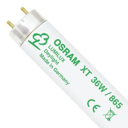 Gli Osram T8 L 36W/865 XT G13 Daylightsono tubi fluorescenti dotati di una potenza di 36W e di attacco G13. La lunghezza degli stessi é di 120cm. La loro vita, incredibilmente lunga, si colloca intorno alle 50.000 ore in media. L'indice di resa cromatica assume un valore tra 80-89Ra. Con una temperatura di colore di 6500K, questi tubi garantiscono una luce molto luminosa (definita "daylight")
