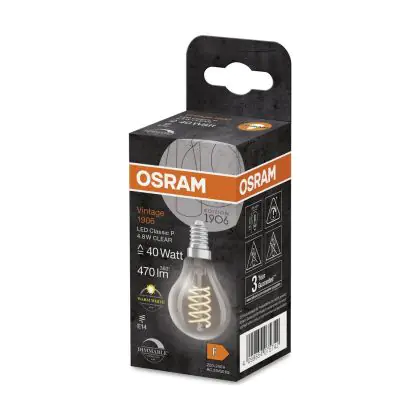 La lampada Osram Vintage 1906 LED Classic Slim E14 Pera Filamento Chiara 4.8W 470lm - 827 Bianco Molto Caldo | Dimmerabile - Sostitutiva 40W è il sostituto perfetto per le tue vecchie lampade 40W con attacco a vite piccolo E14 grazie alla sua tecnologia LED. Passare a LED ti offrirà molti vantaggi!