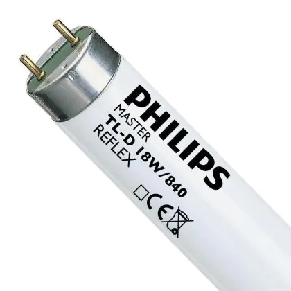 I Philips TL-D Reflex 18W 840 - 59cm (MASTER) sono tubi fluorescenti che presentano una base G13 e misurano 59cm. La potenza di questi tubi fluorescenti corrisponde a 18W. Tali tubi, che rientrano in classe energetica 'A', consentono di indirizzare la luce dove effettivamente serve grazie ad un riflettore interno: questo consente di ottenere il medesimo livello di illuminazione utilizzando solo la metà del numero di lampade nell'apparecchio.