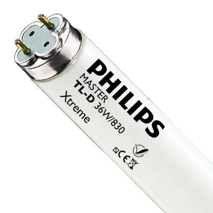 I Philips TL-D Xtreme 36W 830 - 120cm (MASTER) sono tubi fluorescenti che presentano una base G13 e misurano 120cm. La potenza di questi tubi fluorescenti corrisponde a 36W. Tali tubi rientrano in classe energetica 'A'. L'indice di resa cromatica si assesta nell'intervallo di 80-89Ra. La caratteristica peculiare di queste lampade sta nella loro lunga durata veramente eccezionale di 79.000 ore. I tubi in questione profondono una luce bianca calda, corrispondente ad una temperatura di colore di 3000K.