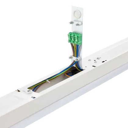Questa reglette LED può essere utilizzata comodamente per l’illuminazione di spazi impegnativi o in linee di assemblaggio. Grazie al cablaggio entra/esci integrato, è possibile collegare diverse reglette al fine di formare una linea luminosa continua.